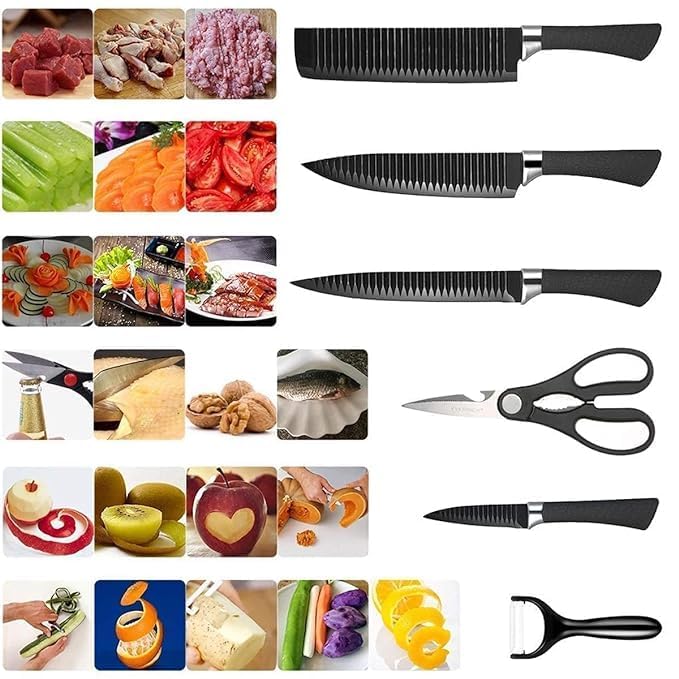 A 6-piece corrugated kitchen knife set is ideal for cutting through crusty bread, fruits, and vegetables without crushing them. Made for precision and durability, this set is perfect for both home cooks and professionals.